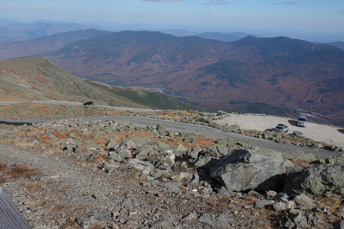 A the road and a corner of the parking lot from near the summit of Mt. Washington.
