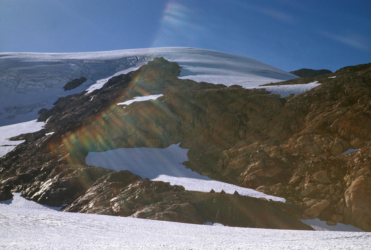 Looking from out on the Blue Glacier toward camp on the moraine and the