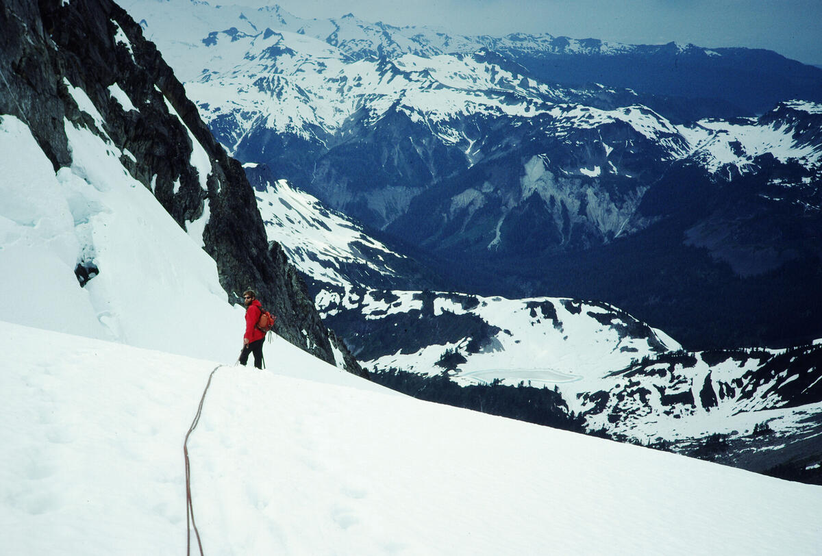 Through the steep section at the Hourglass on the descent from Mt. Shuksan,