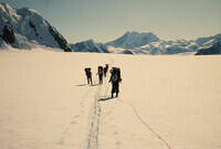 the Kaskawulsh Glacier. The mountain above and slight right of the skiers