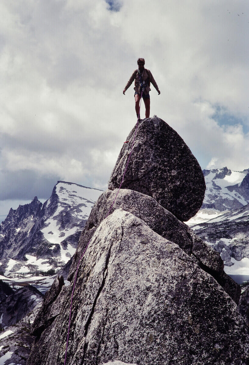 Hal standing on a perched rock on the west ridge of Prusik Peak.