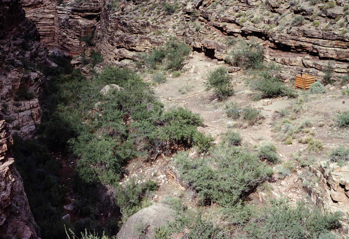 The camp area where the Hermit Trail joins Hermit Creek. The wooden structure