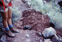is what we found - a large, fresh pit in the trail where one of the rocks had hit. If