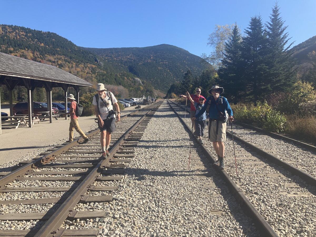 Back at Crawford Notch. Hal, Cliff, Pauline, and John playing on the rails of the tourist train.