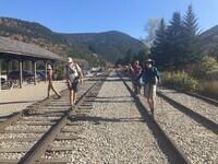 Back at Crawford Notch. Hal, Cliff, Pauline, and John playing on the rails
