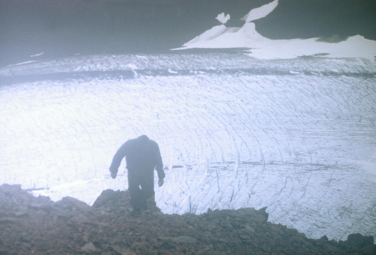 Someone hiking up the rocky area above the bottom of the Blue Glacier