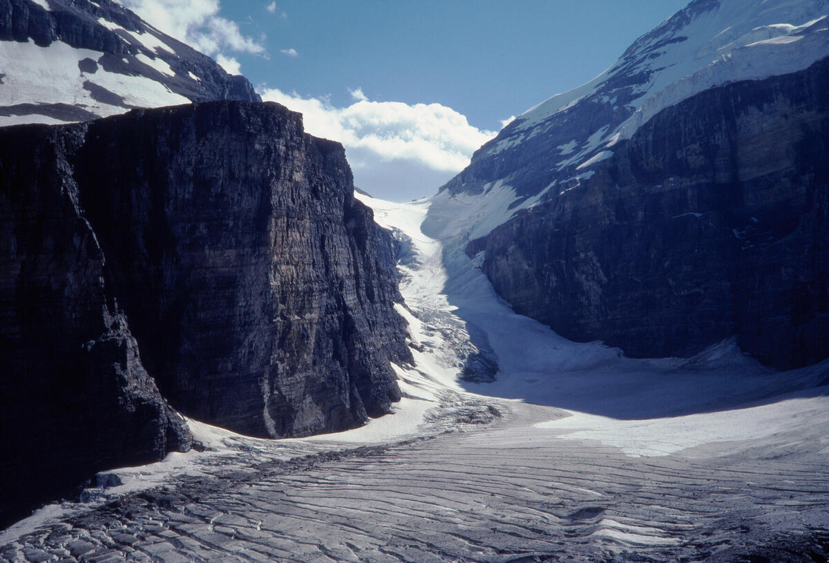 Looking toward Abbot Pass on the Victoria Glacier. The climbing hut is