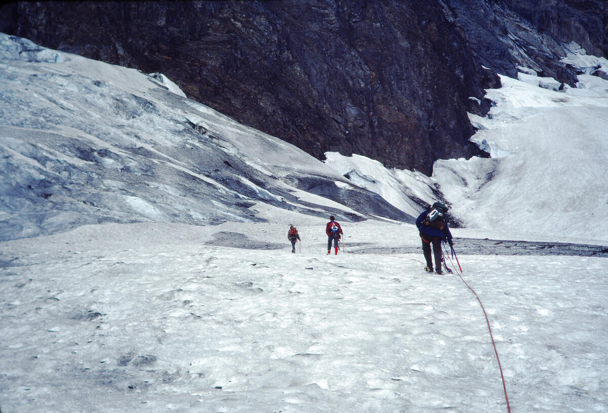 Heading up the glacier toward the col between Commander Mountain and Mt Maye.