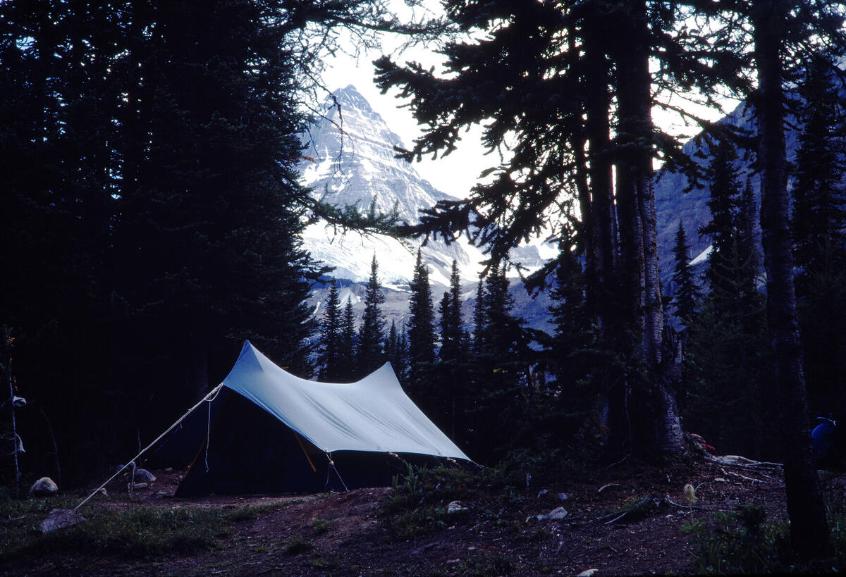 Camp at Magog Lake looking at Assniniboine through the trees.