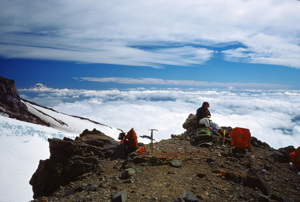 Mt. Hood in the far distance, and Mt. St. Helens, pre-eruption, above and