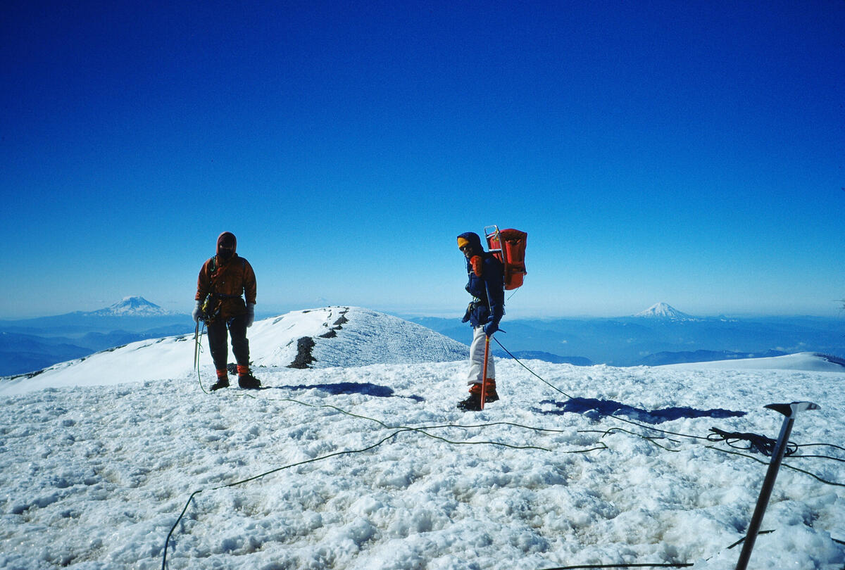 A summit photo of Paul and Lou, with Adams, Hood (barely visible),