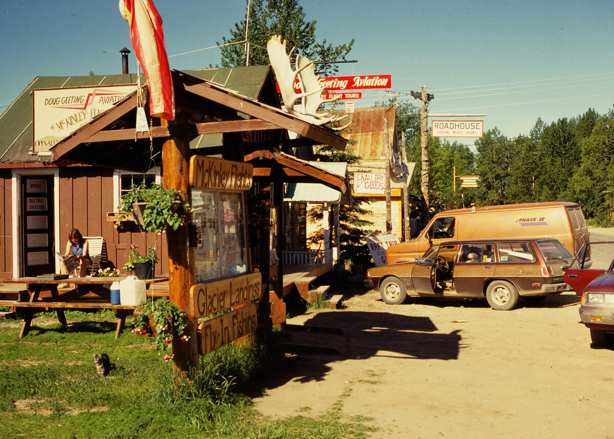 Downtown Talkeetna and the office of Doug Geeting Aviation. The brown Colt