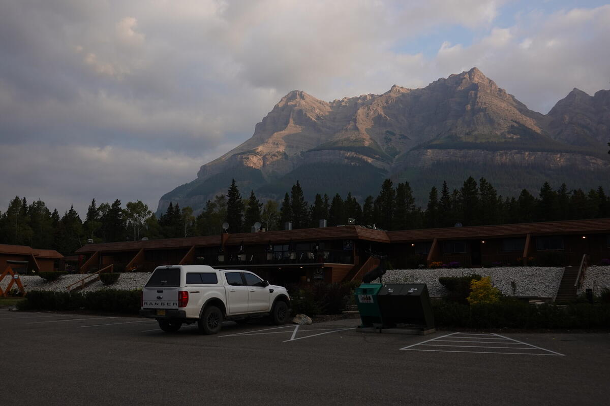 Peaks (Mt. Wilson, I think) to the east of the lodge, and our truck.