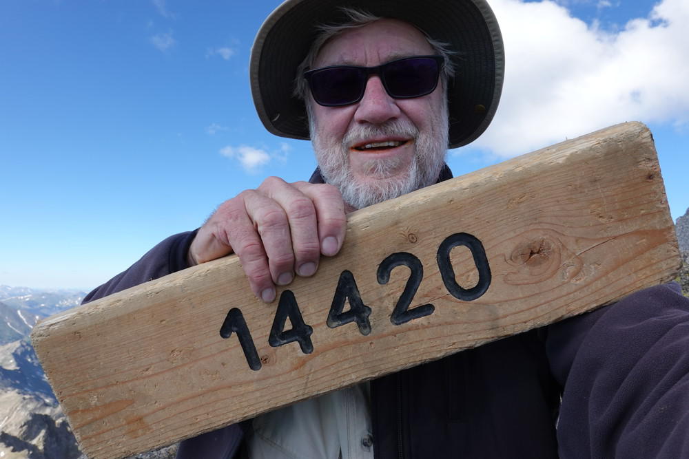 Me holding the sign. This is the other side of the one in the first summit photo that says Mt. Harvard.