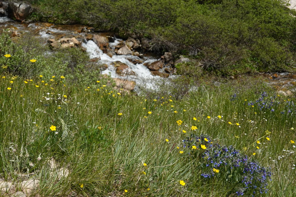 Flowers and a small stream along the access spur trail to Bear Lake.