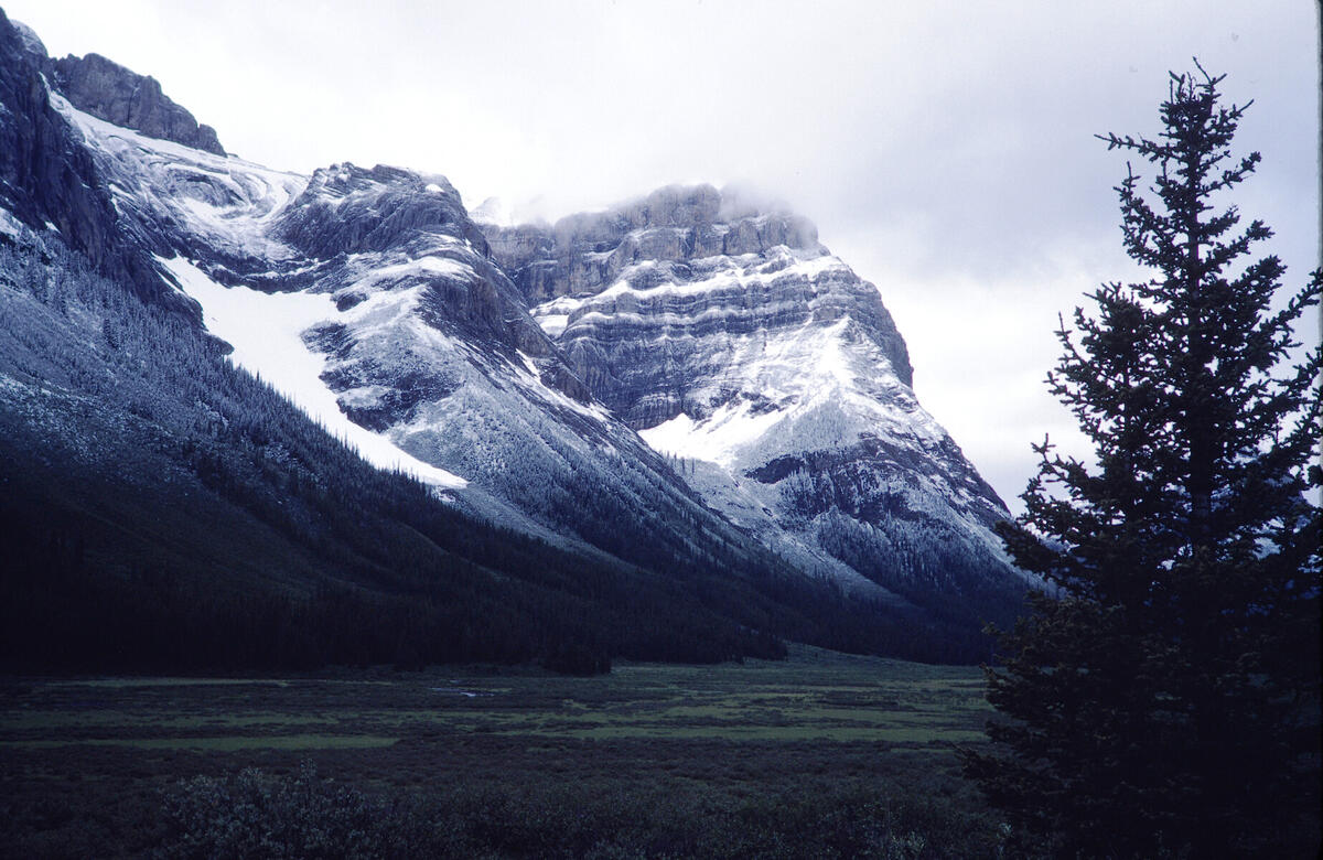Mt. Cautley above Bryant Creek as seen from the Assiniboine Pass Trail. There is a Google Earth match. This is likely from the hike to the base of Assiniboine shown in the following pictures. This was probably an overnight hike based on Hal's memory and a slide, not in this edited show, that shows a backpacking camp.
