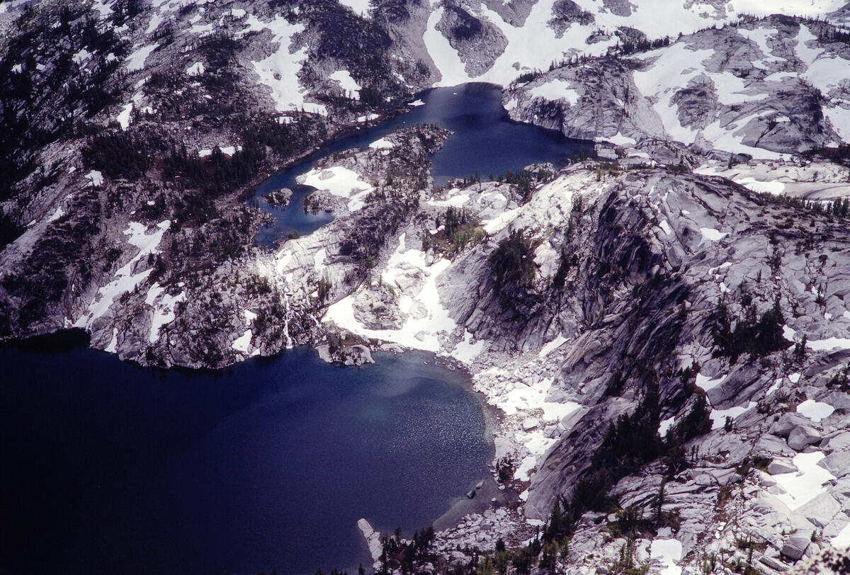 Looking down from Prusik Peak to Lake Viviane and Leprechaun Lake.