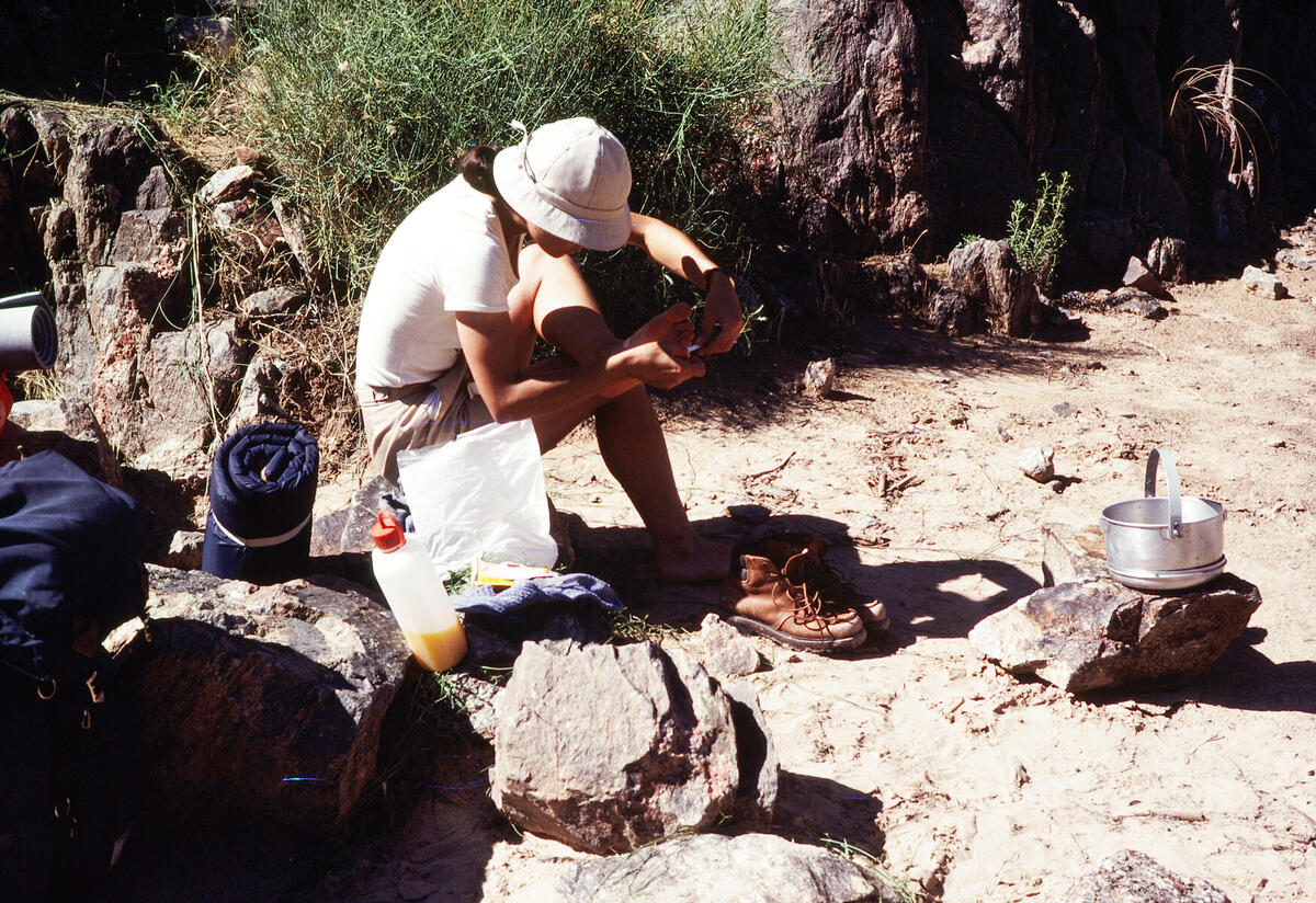 Joan tending to her feet at camp near the Hermit Rapid.