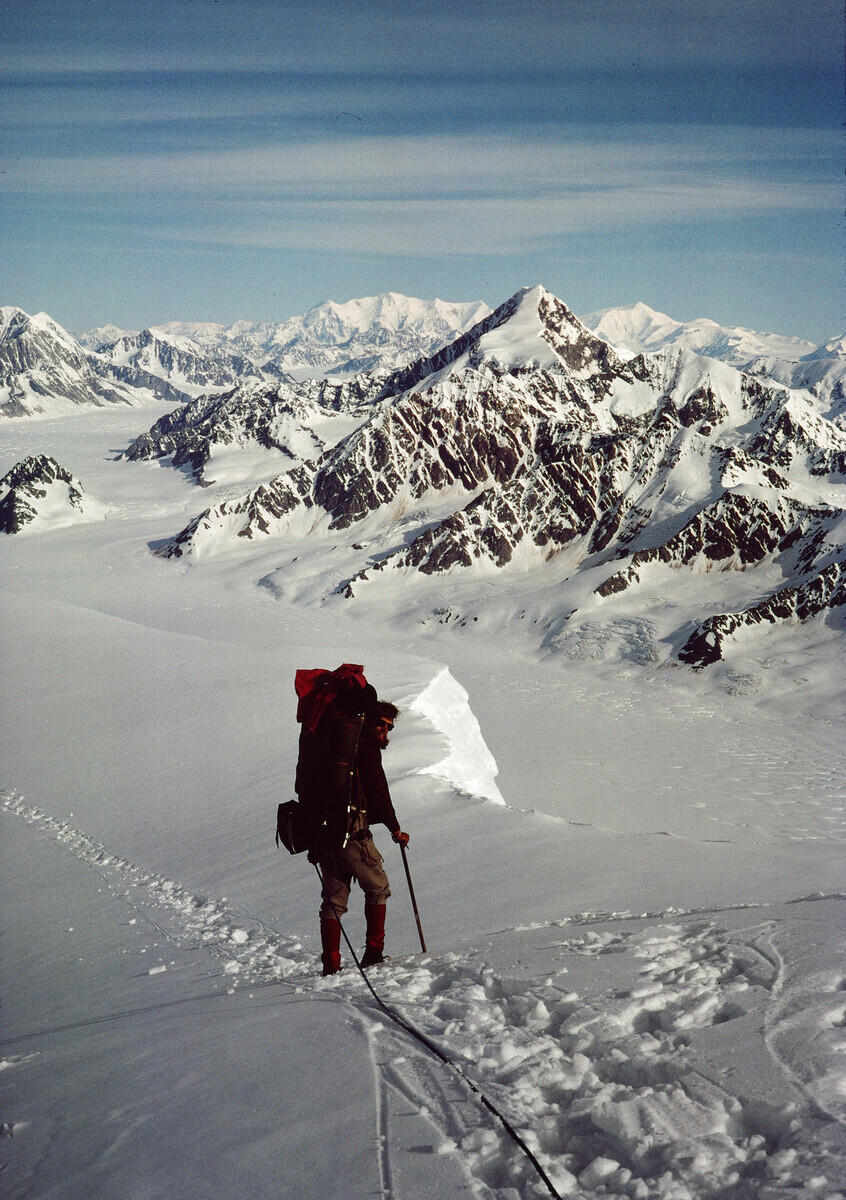 B108S10 Hal Murray along the cornice looking toward Mt. King George from the same location as the previous photo (same bit of cornice visible).