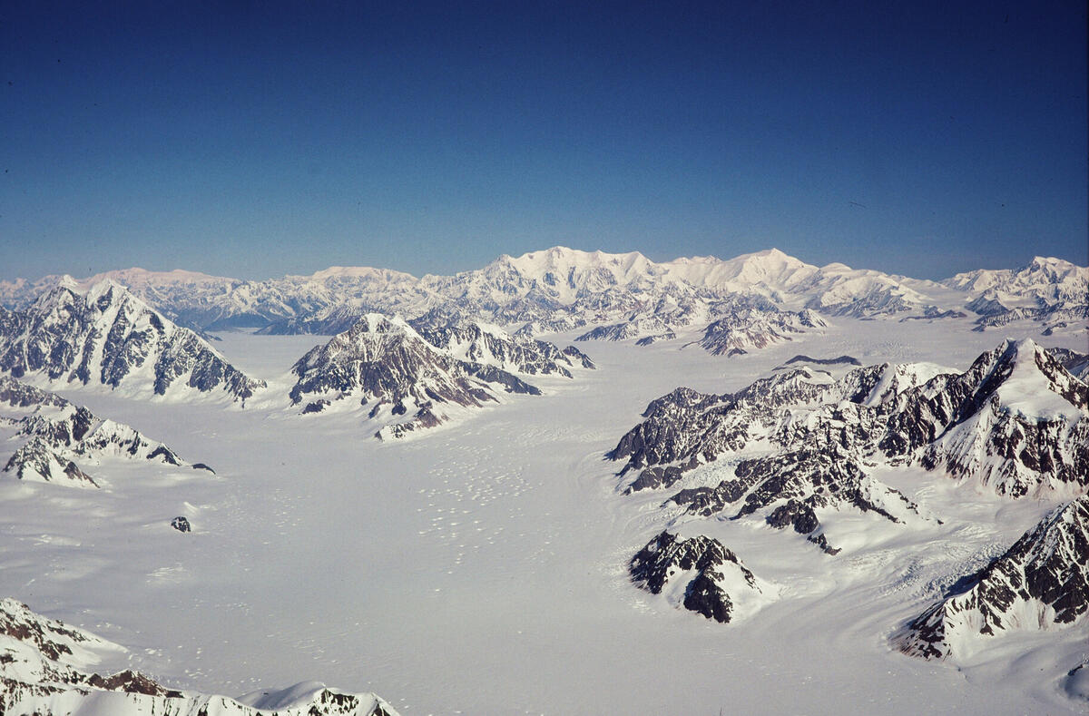 B109S07 Looking up the Hubbard Glacier from the summit of Mt. Vancouver. Mt. King George is at the right edge of the photo.