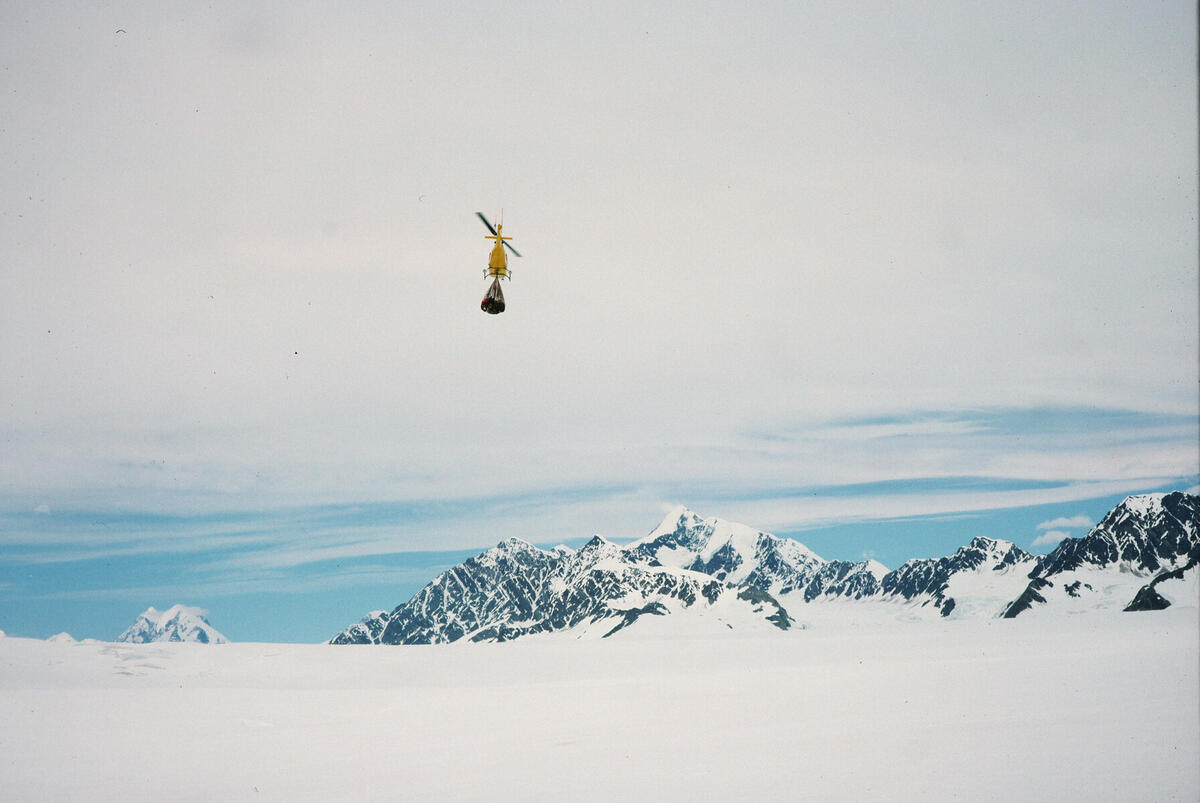 B111D15 I have no more photos of Mt. King George taken from the climb. This photo shows Mt. King George in the background as the helicopter taking out our climbing gear and two member of the party it taking off.
