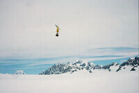 the Kaskawulsh Glacier. The mountain above and slight right of the skiers
