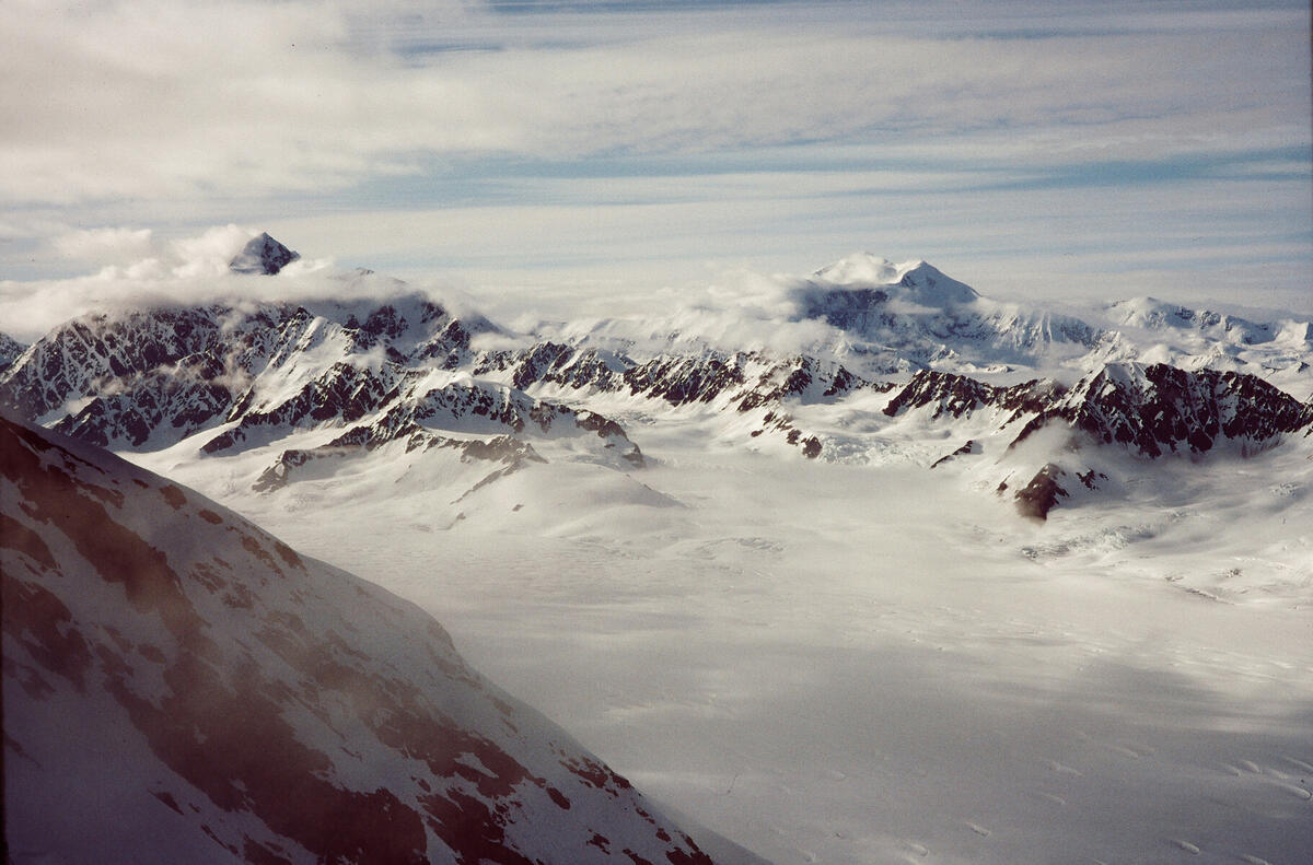 B106S34 Mt. King George and Mt. Queen Mary seen from somewhere not too far below our advance base camp (Camp 2). This was probably taken from our probe of a route on the north side of the ridge that we eventually decided was too dangerous to use.